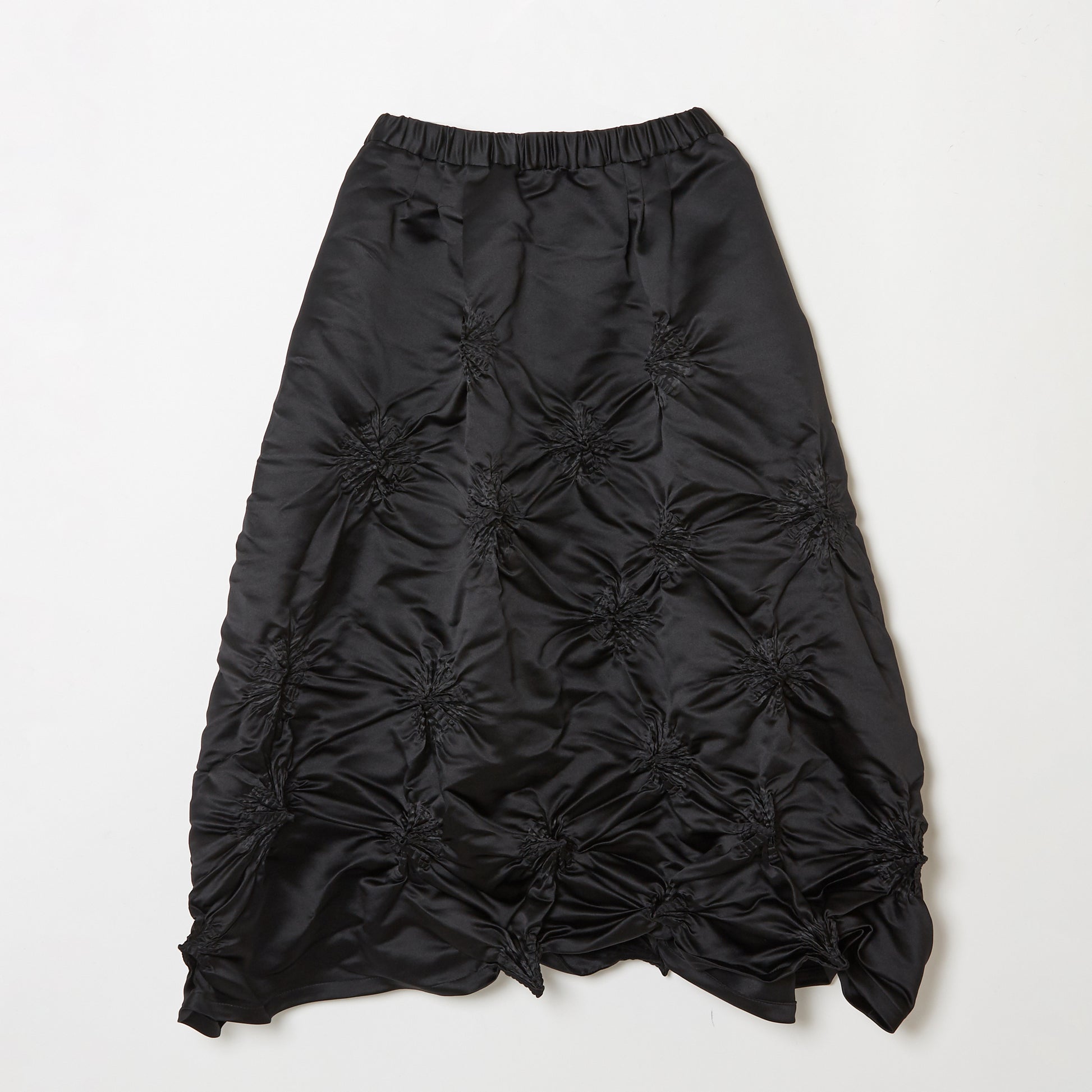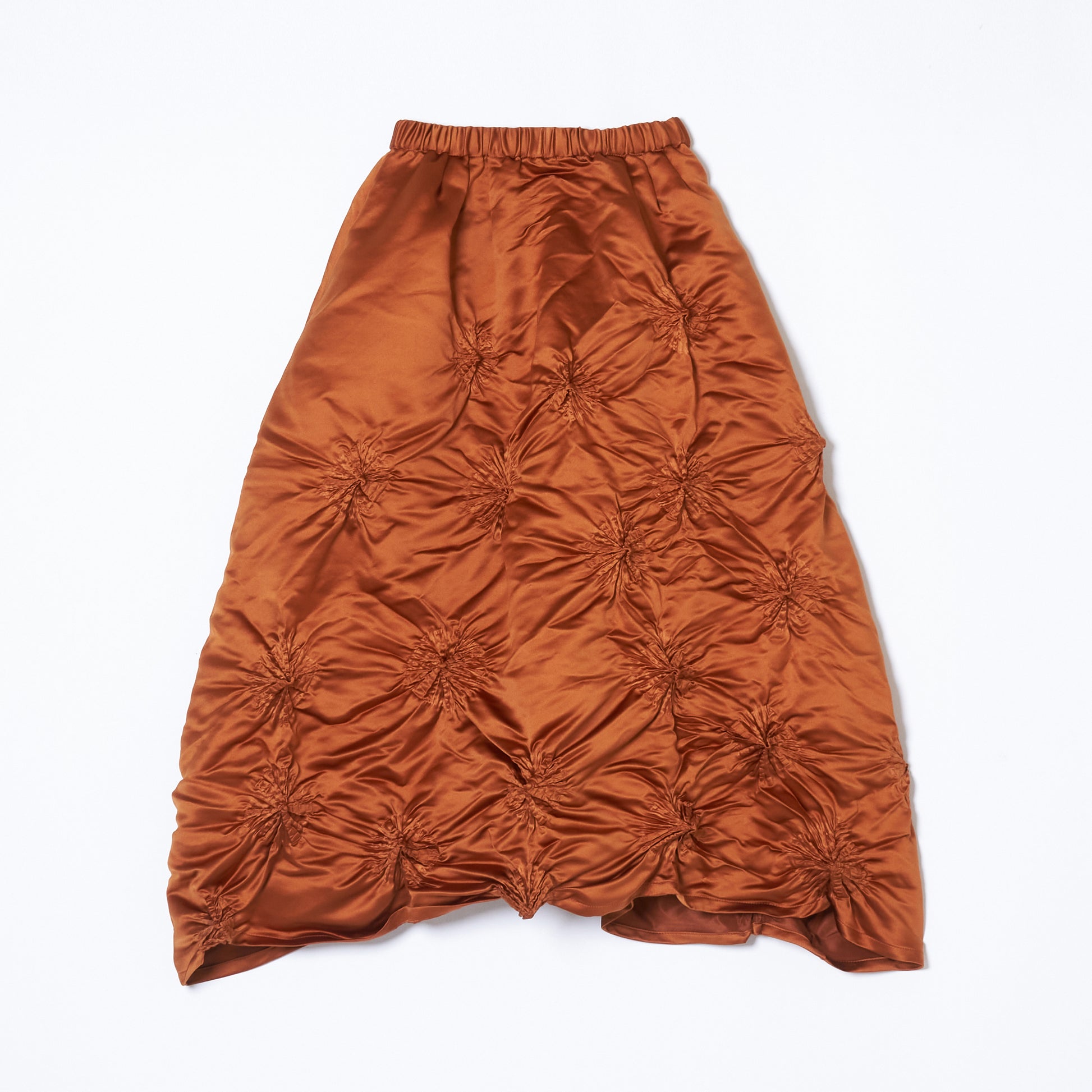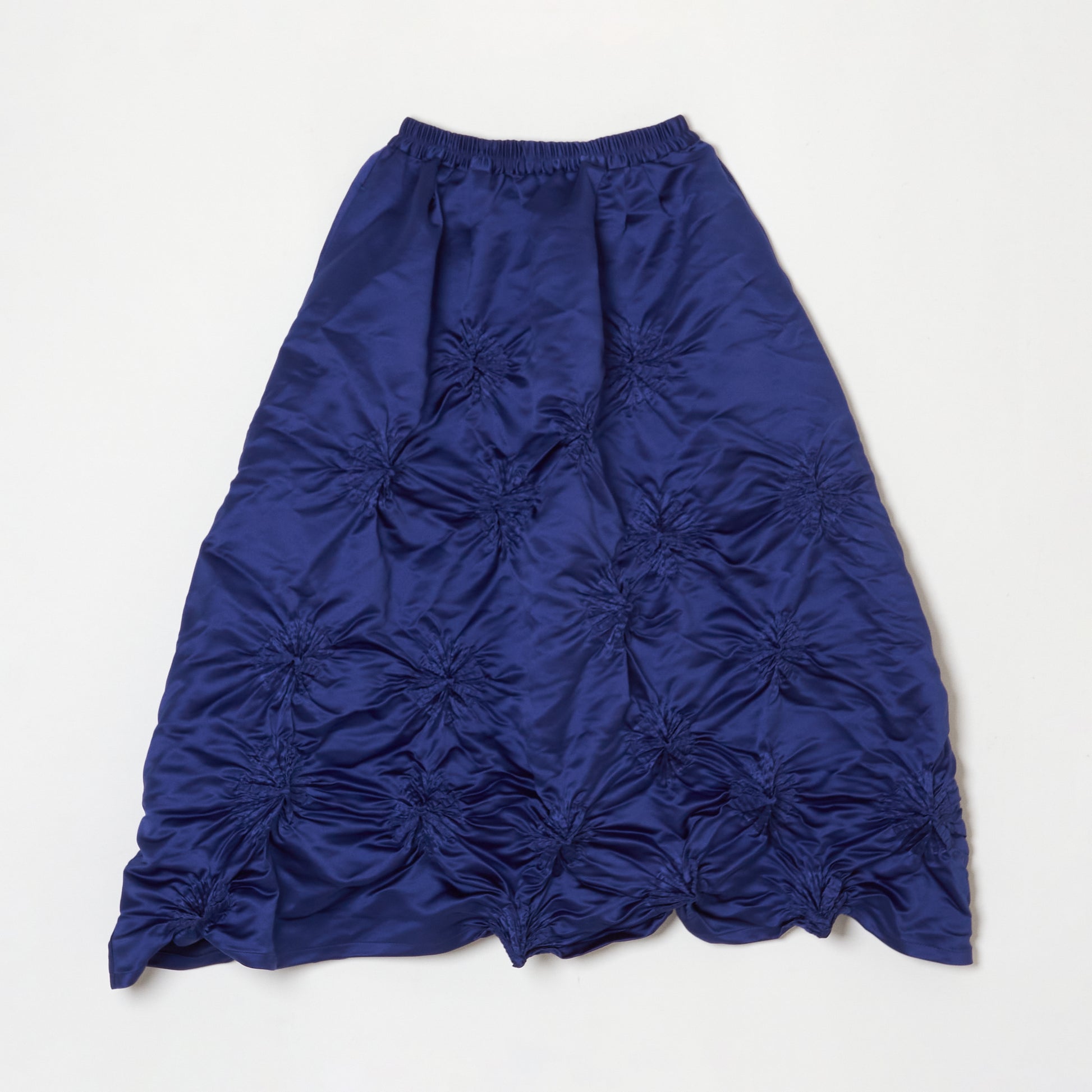 BUNZABURO's Midi-length skirts with bold shibori accents look as if sprinkled with large flowers. The shibori is applied to a polyester fabric with just the right amount of luster, resulting in a piece with a voluminous feel.